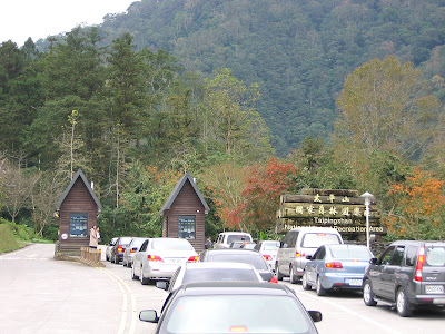 這張照片是站著從天窗拍出去的,入口仍可見葉綠楓紅,十足秋天景色。車窗外溫度其實逼近5度,車潮跟人潮會讓溫度再上昇不少。